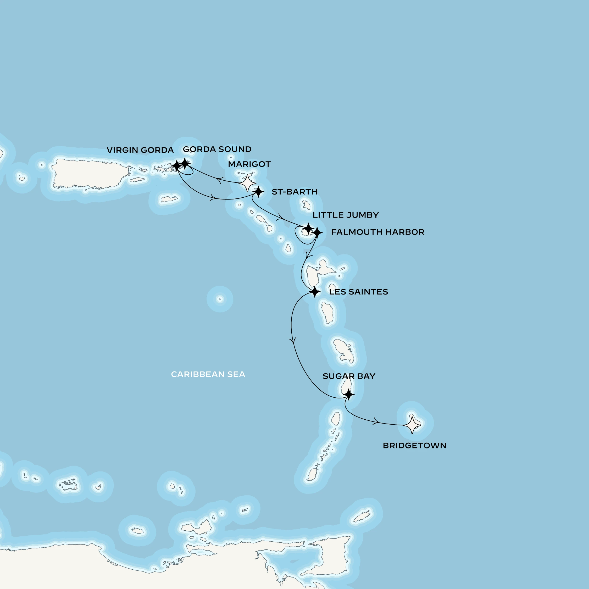 Sailing from charming Marigot, your voyage begins in the BVIs at Virgin Gorda, where towering granite boulders sculpt secret pools, caves, and sun-dappled tunnels at the Baths. From there, you will continue on to a highly coveted and deeply private island for an unforgettable evening. A hint: it will unfold under the spell of a legendary secret agent… In Terre‑de‑Haut, you will attend a candlelit concert at Fort Napoléon, privatized for you, where the music will rise over one of the most beautiful bays in the world. After this exceptional interlude, your journey leads you to Sugar Bay in St. Lucia, dominated by the island’s iconic Pitons, which will make you briefly forget that Bridgetown is the conclusion of your voyage.
